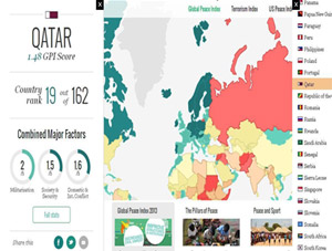Selon les résultats de l’Indice mondial de la paix, Global Peace Index (GPI), pour l’année 2013 et qui ont été annoncés la semaine dernière à Londres, l’État du Qatar obtient la première place au classement des pays du Moyen-Orient et de l’Afrique du Nord (MENA) pour la cinquième année consécutive et la 20ème place au niveau mondial. L'Indice mondial de la paix, établi et publié par l’Institut pour l’économie et la paix, Institute for Economics and Peace (PEI), qui est basé à Sydney, en Australie, se fonde sur l'examen de 24 critères qualitatifs et quantitatifs mesurant la violence interne et externe de chaque pays. Parmi les critères retenus figure la militarisation, la sécurité, les conflits internes, etc.