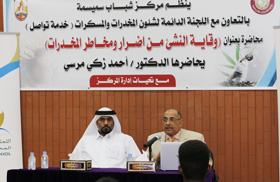 نظمت اللجنة الدائمة لشئون المخدرات والمسكرات بالتعاون مع مركز شباب سميسمة يوم الثلاثاء 23/08/2016م محاضرة توعوية حول أضرار ومخاطر المخدرات والسلوكيات السلبية للنشء، وذلك في إطار المشروع الوطني للتوعية بأضرار ومخاطر المخدرات التي ينظمها برنامج (وقاية) بالنوادي الشبابية والمراكز الصيفية، لرفع مستوى الوعي بأضرار المخدرات في صفوف الشباب، وإعداد كوادر شبابية قادرة على حماية المجتمع من آفة المخدرات.