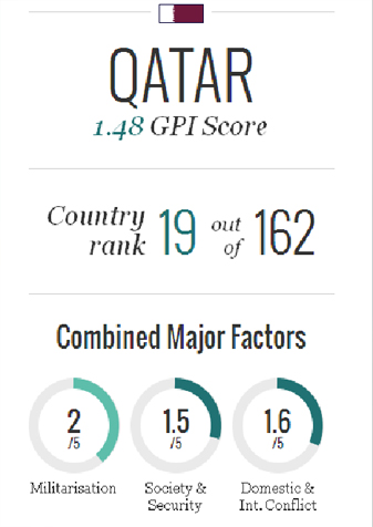 وجاءت قطر في المرتبة الأولي على مستوى دول الشرق الأول وشمال افريقيا وفي المرتبة الـ(19) على المستوى العالمي من بين (162) دولة شملها التقرير لهذا العام بدخول (4) دول إضافية عن العام الماضي الذي شمل (158) دولة. وأحرزت (1.48) درجة لهذا وشهد مؤشر السلام العالمي لهذا العام كما جاء في التقرير انخفاضا بسبب زيادة الإنفاق العسكري وعدم الاستقرار السياسي والأمني في عدة دول مختلفة بالإضافة إلى الارتفاع الكبير في عدد حالات القتلى، الأمر الذي أدى إلى جعل العالم مكانا أقل استقرارا وسلاما وفق بيانات المؤشر.