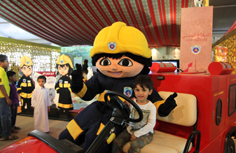 على الزوار ، وتأتى هذه المشاركة في اطار حرص الادارة العامة للدفاع المدني على الاستفادة من المناسبة الوطنية لنشر الوعى بإجراءات السلامة وتعزيز روح الانتماء لدى النشء وحثهم على تحمل المسئولية والحفاظ على الممتلكات العامة والخاصة ومواجهة الاخطار من خلال الالتزام بإجراءات السلامة .