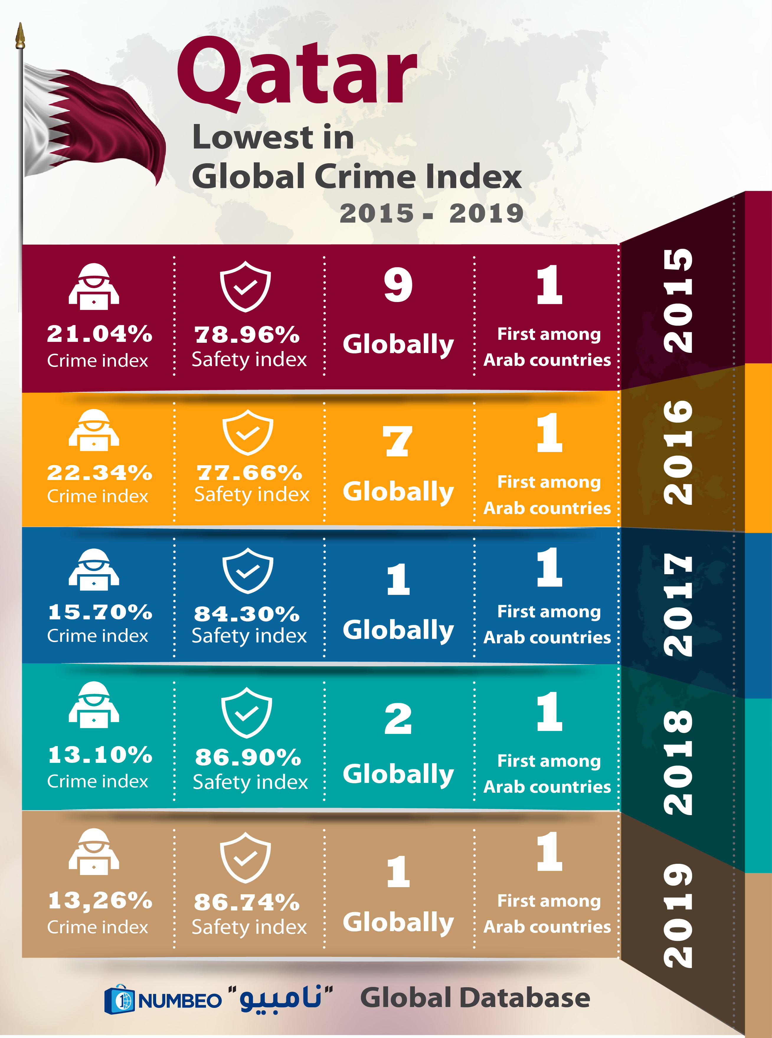 Qatar's superiority over this period is considered as an extension of its achievements in the past years, specifically during the period (2015-2019), where it maintained the number one position in the Arab world throughout this period, as well as achieving first place globally in 2017, 2019. It reflects the constant and outstanding level enjoyed by the State in the field of security and safety, and the significant decrease in the rates of crimes in the country during that period.