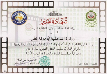 فازت وزارة الداخلية ممثلة في إدارة العلاقات العامة، بالمركز الأول في مسابقة الأفلام التوعوية لعام 2012م ، عن الفيلم الذي أعدته في مجال مكافحة الاتجار بالبشر.